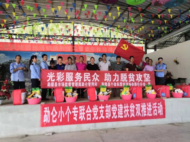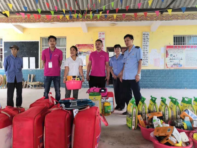 勐侖鎮(zhèn)市場(chǎng)監(jiān)督管理局和田野公司人員一起對(duì)貧困戶發(fā)放物資